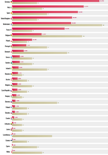 Nel grafico in basso la stima della deforestazione tropicale inclusa nei prodotti importati (usati e consumati) tra il 2005 e il 2017 nell'UE28 per singolo Stato. Deforestazione media annuale (periodo 2005-2017) in ettari (barre rosse) e deforestazione pro capite media annuale in metri quadrati (barre beige).