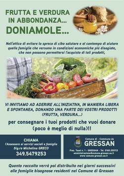 Gli Orti Sostenibili, già realizzati in tante parte d’Italia, hanno l’obiettivo, tra l'altro, di coltivare prodotti freschi ortofrutticoli per uso domestico ma il più da distribuire sul territorio alle famiglie bisognose. Il Comune di Gressan rivolge un invito a tutti i coloro che coltivano un orto o un frutteto, chiedendo di donare l’eccesso di produzione ai concittadini meno fortunati.