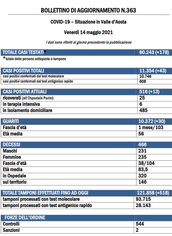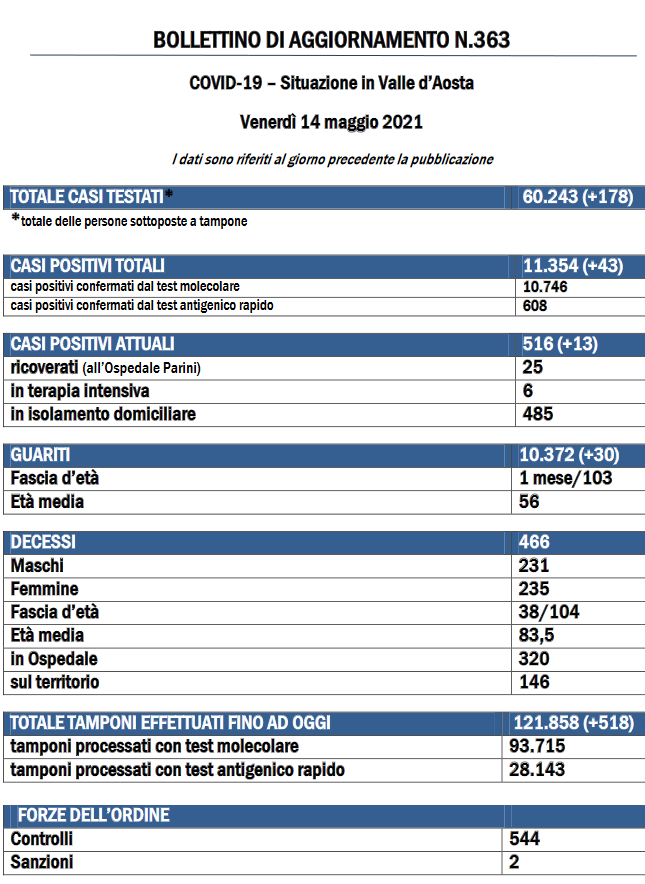 Aumentano i contagi da coronavirus in Valle d'Aosta: nelle ultime 24 ore sono stati rilevati 43 nuovi casi positivi al Covid-19 su 178 persone sottoposte a tampone.