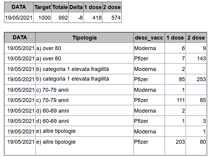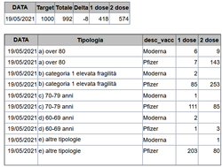 Tabella delle vaccinazioni effettuate in Valle d'Aosta in data 19 maggio 2021