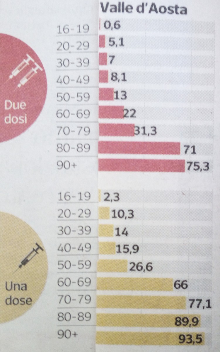 Infatti per le due vaccinazioni è ferma, come riportato dal Corriere della Sera, al 75,3% per la doppia vaccinazione degli ultra novantenni e al 71 per cento per gli over 80. Le cose vanno leggermente meglio per la prima dose. Sono infatti il 93,5% in valdostani con più di 90 vaccinati, ma la percentuale scende all’89,9% per i over 80.