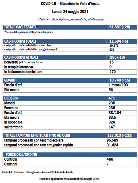 I ricoveri ospedalieri sono 15, uno meno di ieri e la terapia intensiva del Parini di Aosta rimane Covid free.