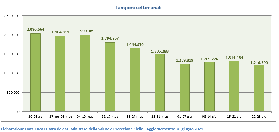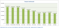 · tamponi settimanali: da 1.314.484 a 1.210.390 (-7,9%).