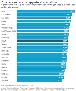 La Regione Lazio ha la più alta percentuale di persone vaccinate (ciclo completo) rispetto alla popolazione col 38,1%, la media italiana è pari a 33,5%.