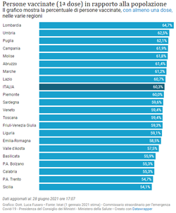 La Lombardia è la regione con la più elevata percentuale di vaccinati (almeno una dose) in rapporto alla popolazione col 64,7%, la media italiana è pari a 60,3%.