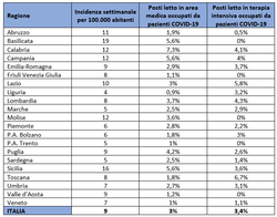 Regione | Incidenza settimanale per 100.000 abitanti | Posti letto in area medica occupati da pazienti COVID-19 | Posti letto in terapia intensiva occupati da pazienti COVID-19 |