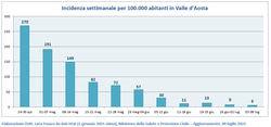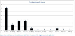Non si registrano decessi in Valle d’Aosta da due settimane consecutive. Il prossimo grafico evidenzia il trend settimanale.