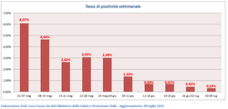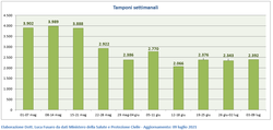 Il numero dei tamponi settimanali è pressoché stabile, si passa da 2.343 a 2.392 (+2,1%), in media 342 al giorno.