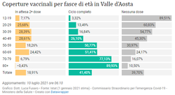 Al 10 luglio (aggiornamento ore 06:10), il 18,9% della popolazione over 12 è in attesa della 2ᵃ dose (n. 21.148), il 41,4% ha completato il ciclo vaccinale (n. 46.304), il 39,7% non ha ricevuto alcuna dose (n. 44.400), il 60,3% ha ricevuto almeno una dose di vaccino (n. 67.452).