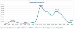 Aumentano gli attualmente positivi da 47.525 a 68.236 (+43,6%). Dal picco del 28 marzo si è passati da 573.235 a 68.236 (-88,1%).