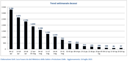 Dopo 14 settimane consecutive di calo, i decessi riprendono a salire. Nell’ultima settimana si attestano a 97 (+12,8%), in media 14 al giorno.
