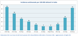 L’incidenza settimanale per 100.000 abitanti si è ridotta solo in Molise (da 25 a 19).