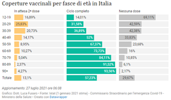 Al 27 luglio (aggiornamento ore 06:08), il 13,1% della popolazione over 12 è in attesa della 2ᵃ dose (n. 6.995.888), il 57,23% ha completato il ciclo vaccinale (n. 30.558.065), il 29,67% non ha ricevuto alcuna dose (n. 15.845.289), il 70,33% ha ricevuto almeno una dose di vaccino (n. 37.553.953).
