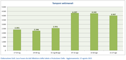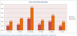 Il numero dei tamponi settimanali diminuisce da 4.242 a 3.997 (-5,8%), in media 571 al giorno.