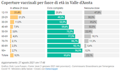 Al 27 agosto (aggiornamento ore 17:48), il 9,3% della popolazione over 12 è in attesa della 2ᵃ dose (n. 10.397), il 65,6% ha completato il ciclo vaccinale (n. 73.321), il 25,1% non ha ricevuto alcuna dose (n. 28.093), il 74,9% ha ricevuto almeno una dose di vaccino (n. 83.718).