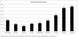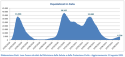 Sul fronte ospedaliero si conferma un incremento percentuale dei ricoveri: +5,4% in area medica e +7,9% in terapia intensiva. In termini assoluti, il numero di posti letto occupati da parte di pazienti COVID in area medica è passato dal minimo di 1.088 del 16 luglio ai 4.252 del 31 agosto e quello delle terapie intensive dal minimo di 151 del 14 luglio ai 544 del 31 agosto. Il numero di ospedalizzati è passato dal minimo di 1.242 del 15 luglio a 4.796 del 31 agosto. Gli ospedalizzati erano 1.382 il 31 agosto 2020 quindi l’aumento è stato di 3.414 (+247%). Lo scorso anno si ebbe il picco di ricoverati il 23 novembre con 38.507.