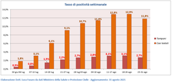 Nella settimana 25-31 agosto i contagi calano da 45.251 a 45.134 (-0,3%) e questo nonostante l’aumento dell’attività di testing (+8,9% casi testati e +14,7% tamponi); ciò è dovuto ad una riduzione della circolazione del virus come dimostra il tasso di positività sceso da 3,1% a 2,7% quello calcolato sui tamponi e da 12,9% a 11,8% quello sui casi testati.