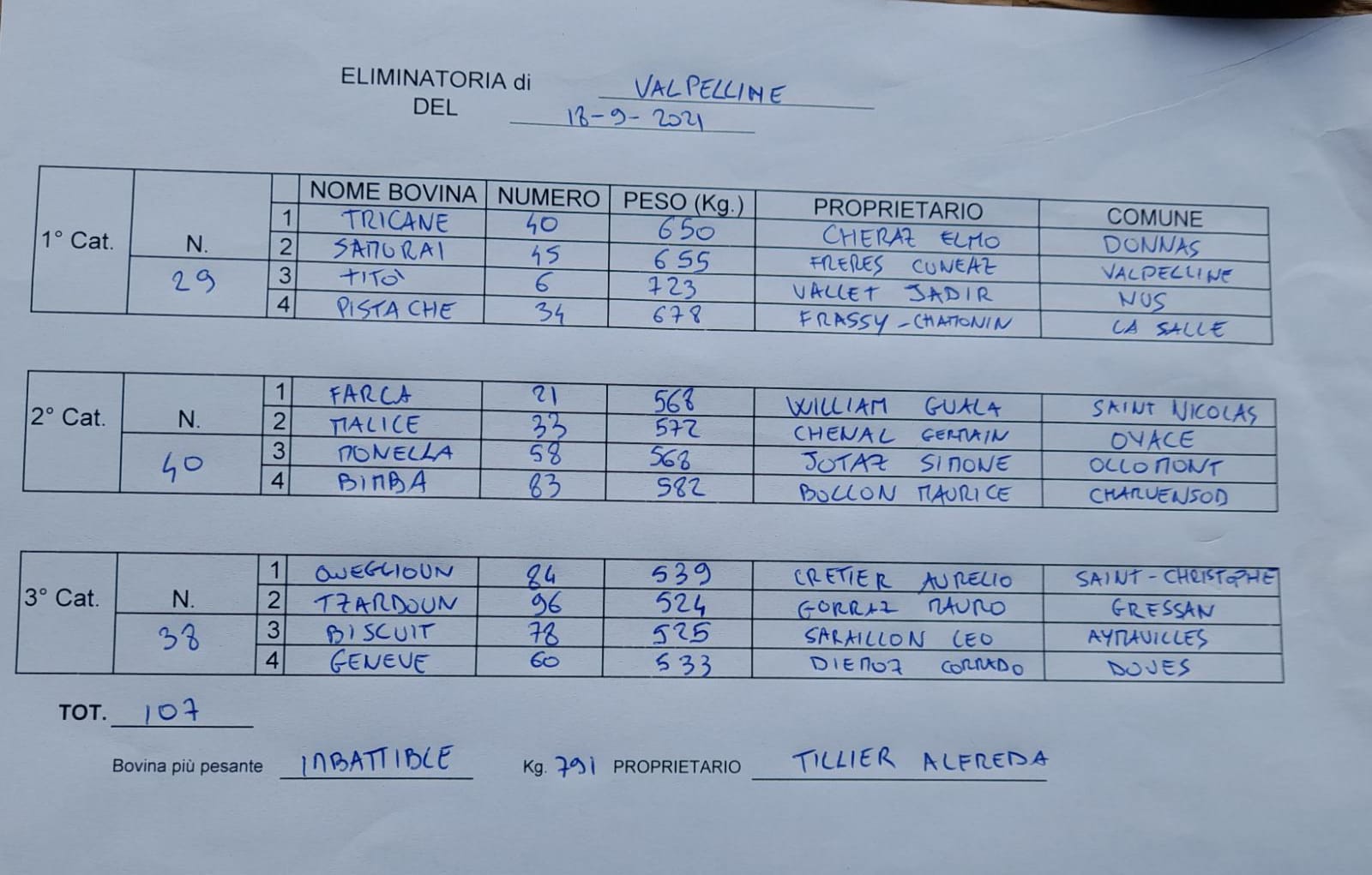 A dominare la scena è stata Tricane (650 kg.) di Elmo Cheraz, allevatore di Donnas, che ha sconfitto la padrona di casa Samorai (655 kg.) dei fratelli Cuneaz. Per il terzo e quarto posto Titò (723 kg.) di Jadir Vallet di Nus ha messo sotto Pistace (678 kg.) di Frassy_Chamonin di La Salle.