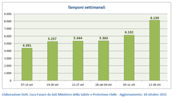 Il numero dei tamponi settimanali, a seguito dell’obbligo del Green Pass sui luoghi di lavoro, cresce notevolmente (+2.007) come nel resto delle altre regioni e passa da 6.132 a 8.139 (+32,7%), in media 1.163 al giorno.