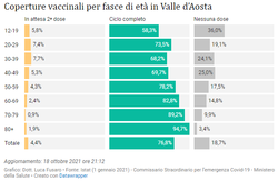 Al 18 ottobre (aggiornamento ore 21:12) il 4,4% della popolazione over 12 è in attesa della 2ᵃ dose (n. 4.953), il 76,8% ha completato il ciclo vaccinale (n. 85.923), il 18,7% non ha ricevuto alcuna dose (n. 20.935), l’81,3% ha ricevuto almeno una dose di vaccino (n. 90.876).