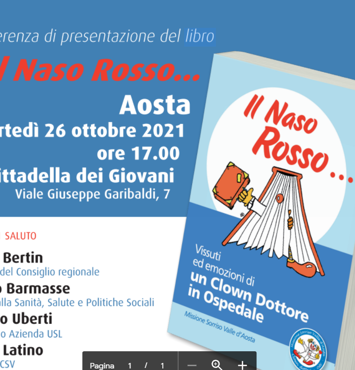 Martedì 26 ottobre, alle ore 17, la Cittadella dei Giovani di Aosta ospita la presentazione del libro 'Il naso rosso, vissuti ed emozioni di un clown dottore in ospedale', realizzato dall'associazione Missione Sorriso Valle d'Aosta - Clown Dottori, con il patrocinio del Consiglio Valle e della Usl VdA.