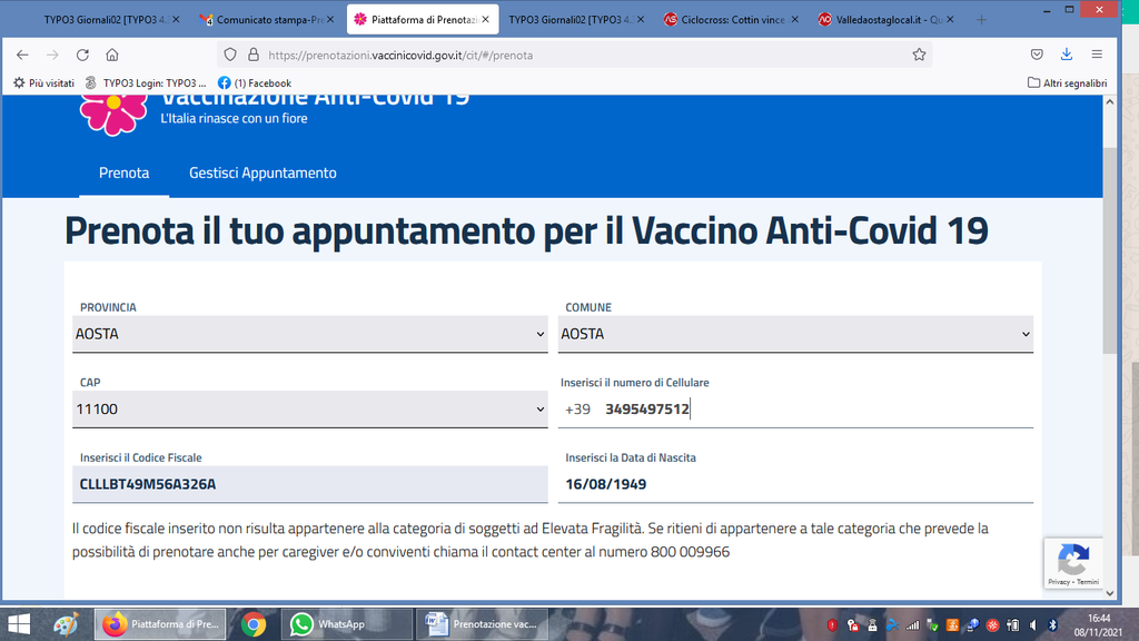 Da lunedì scorso è possibile, accedere al sistema online di prenotazione che consente di scegliere il Centro vaccinale tra quelli disponibili (Pollein-Grand Place che da lunedì 15 novembre sostituisce Aosta-Palindoor, Morgex, Chậtillon e Donnas) e prendere l’appuntamento per la somministrazione. Per la prenotazione, oltre ai dati anagrafici, il sistema richiederà anche la tessera sanitaria.
