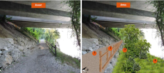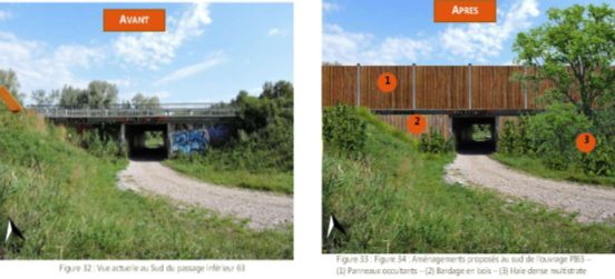 A Etrembières et Nangy, les chemins situés sous l'autoroute, au niveau des piles des deux ponts qui enjambent l'Arve sont réaménagés et végétalisés pour rassurer la faune.