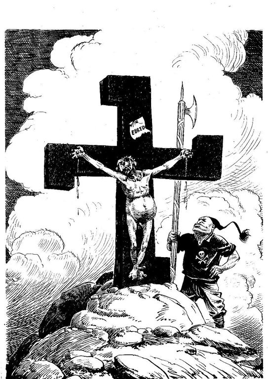 L’umorismo, se di umorismo si può parlare, si ritaglia una particina nel disegno con la caricatura di Mussolini mentre l’ebreo crocifisso, nudo, circonciso e rappresentato con il classico topos del grosso naso adunco, tanto da parere anche lui caricaturato, è invece la rappresentazione che ne dà il nazi-fascismo perché chi ha occhi per vedere capisca che il razzismo trasfigura sempre le sue vittime per renderle per prima cosa esteticamente brutte e poi facilmente identificabili.