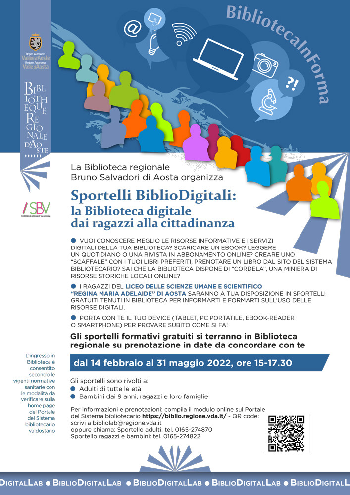Gli sportelli, gratuiti e su prenotazione, si svolgeranno in Biblioteca regionale dal 14 febbraio al 31 maggio e sono destinati sia agli adulti sia a ragazzi e bambini dai 9 anni accompagnati dai genitori, per conoscere ed imparare a utilizzare su propri device (pc portatile, tablet, ebook-reader o smarthphone) le risorse informative e i servizi digitali del Sistema bibliotecario valdostano.