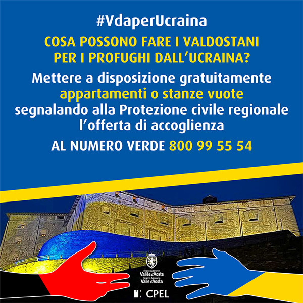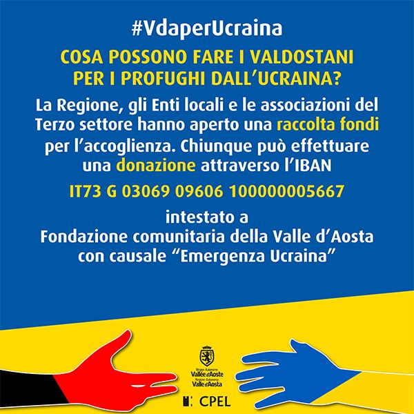 Inoltre è stata definita l’attivazione di una raccolta fondi congiunta per l’assistenza alle persone che raggiungono la Valle d’Aosta dallo scenario di guerra: è possibile contribuire attraverso donazioni sul conto corrente IBAN IT73 G 03069 09606 100000005667 (intestato a Fondazione Comunitaria della Valle d’Aosta) con la causale ‘Emergenza Ucraina’. L’iniziativa riunisce gli sforzi degli enti locali (Regione e Cpel) e del Terzo settore (rappresentato da Fondazione Comunitaria e CSV), con lo scopo di finanziare anzitutto le iniziative di accoglienza dei profughi sul territorio valdostano.