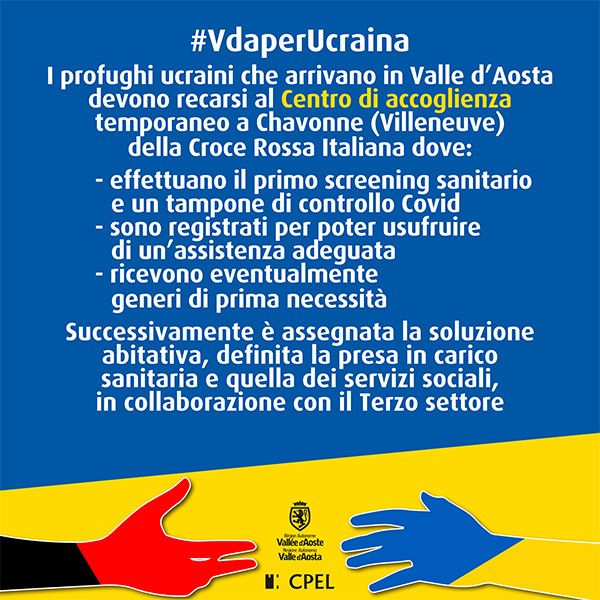 In base alla procedura definita oggi, all’arrivo in Valle d’Aosta i profughi devono recarsi al centro di accoglienza temporaneo della Croce Rossa Italiana situato a Chavonne (Villeneuve) dove sarà effettuati uno screening sanitario e un primo tampone Covid: potranno quindi essere registrati per usufruire di un’assistenza adeguata e riceveranno eventualmente anche generi di prima necessità. Successivamente sarà assegnata la soluzione abitativa, sarà definita la presa in carico sanitaria e quella dei servizi sociali, in collaborazione con le associazioni e realtà del Terzo settore. E’ previsto anche l’impiego di mediatori linguistici.