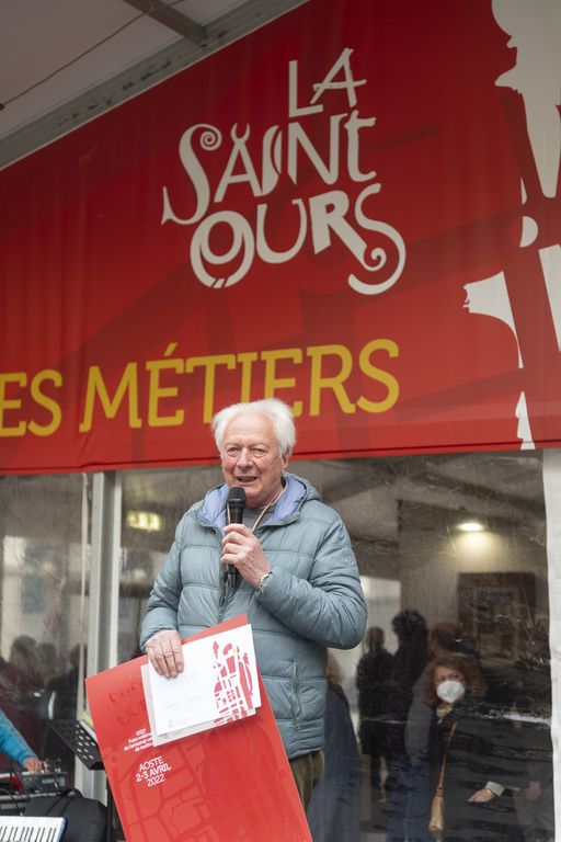 Motivation: parmi les nombreuses représentations de Saint-Ours exposées cette année, celle de Guido Diémoz se signale pour le contexte d’architecture très connu, un des emblèmes de la Ville d’Aoste, où notre Saint fait le don des sabots aux pauvres, presque caché par eux, afin que son aumône soit secrète selon l’évangile.
