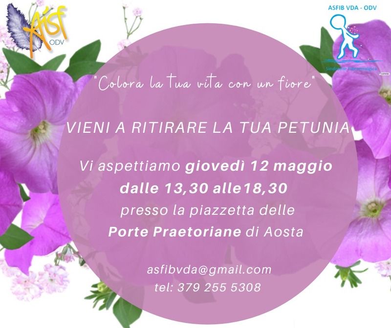 Due gli appuntamenti: domani dalle 9.30 alle 19 all'ipermercato Gros Cidac di Aosta (dove sarà possibile anche personalizzare le petunie in occasione della Festa della Mamma) e giovedì 12 maggio dalle 13.30 alle 18.30 nella piazzetta delle Porte Pretoriane di Aosta.