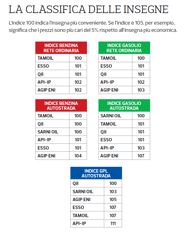 Per rendere più facilmente leggibili i risultati, la media di ogni insegna è rappresentata attraverso un indice: l’indice 100 indica la compagnia più conveniente. In rapporto a quest’ultima, per esempio, l’insegna che ha indice 104 nel periodo considerato ha applicato prezzi medi più alti del 4%.