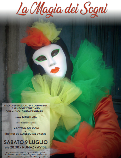 Dopo il successo di pubblico ottenuto domenica scorsa all’Auditorium di Aymavilles con lo spettacolo “Rêves” il gruppo di maschere veneziane de La Bottega dei Sogni si esibirà sabato 9 luglio, alle ore 20.30, in loc. Runaz di Avise con lo spettacolo “La Magia dei Sogni”.
