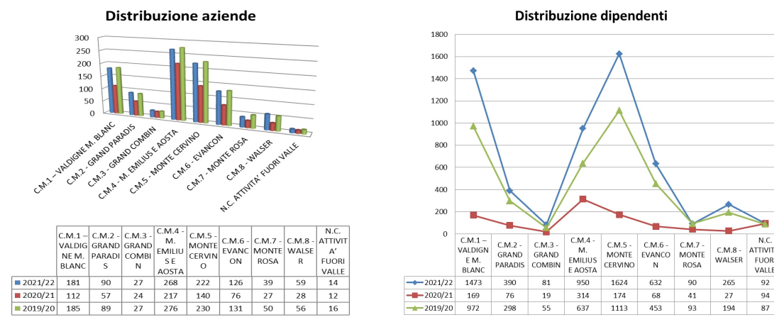 La terza parte ed ultima parte del rapporto prende in esame l’andamento nelle Comunità Montane. Riportiamo due grafici riepilogativi del confronto del numero di aziende e di dipendenti nelle tre stagioni oggetto di studio