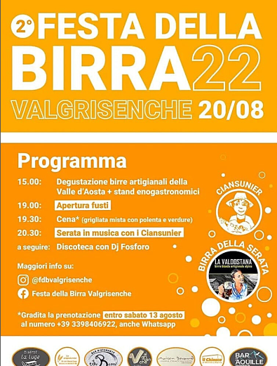 Dopo il successo riscosso con la precedente edizione torna a Valgrisenche la festa della birra, una giornata di divertimento tra degustazioni, stand gastronomici, grigliata, musica e soprattutto birra! La festa avrà inizio nel primo pomeriggio con la degustazione delle birre artigianali e gli stand gastronomici, per poi continuare fino a sera con grigliata, serata in musica con “I Ciansunier” e seguire Dj set con Dj Fosforo.