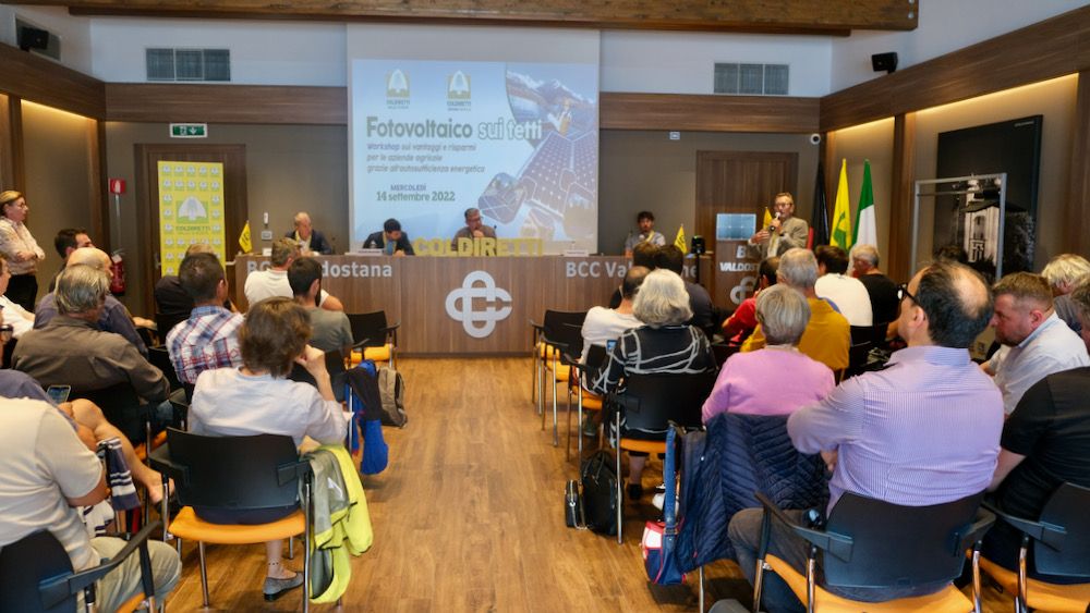 Una settantina di aziende agricole hanno preso parte oggi, mercoledì 14 settembre, al workshop organizzato da Coldiretti Valle d’Aosta e Coldiretti Giovani Impresa, presso la sala conferenze della BCC di Aosta, e dedicato ai finanziamenti per l’installazione di pannelli fotovoltaici sui tetti delle aziende agricole previsti dal Bando Agrisolare.