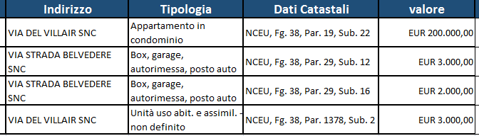 Le informazioni fanno riferimento alla tipologia e consistenza dei beni, mentre la destinazione d’uso è in fase di definizione.