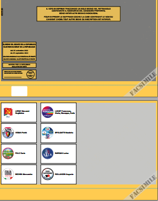 Sono 2 le schede elettorali: una gialla per il Senato e una rosa per la Camera. Il voto si esprime tracciando un solo segno nel rettangolo contenente il nominativo del candidato scelto. Sono vietati altri segni o indicazioni.