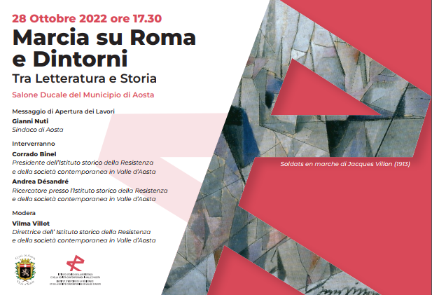 L’ Istituto Storico della Resistenza e della società contemporanea in Valle d’Aosta-Institut d’Histoire de la Résistance et de la société contemporaine en Vallée d’Aoste, in occasione del centenario della Marcia su Roma del 28 ottobre 1922, organizza venerdì 28 ottobre 2022 l’incontro Marcia su Roma e dintorni. Tra letteratura e storia, alle ore 17.30 presso il Salone Ducale dell’Hôtel de Ville, in piazza Émile Chanoux, n. 1 ad Aosta.