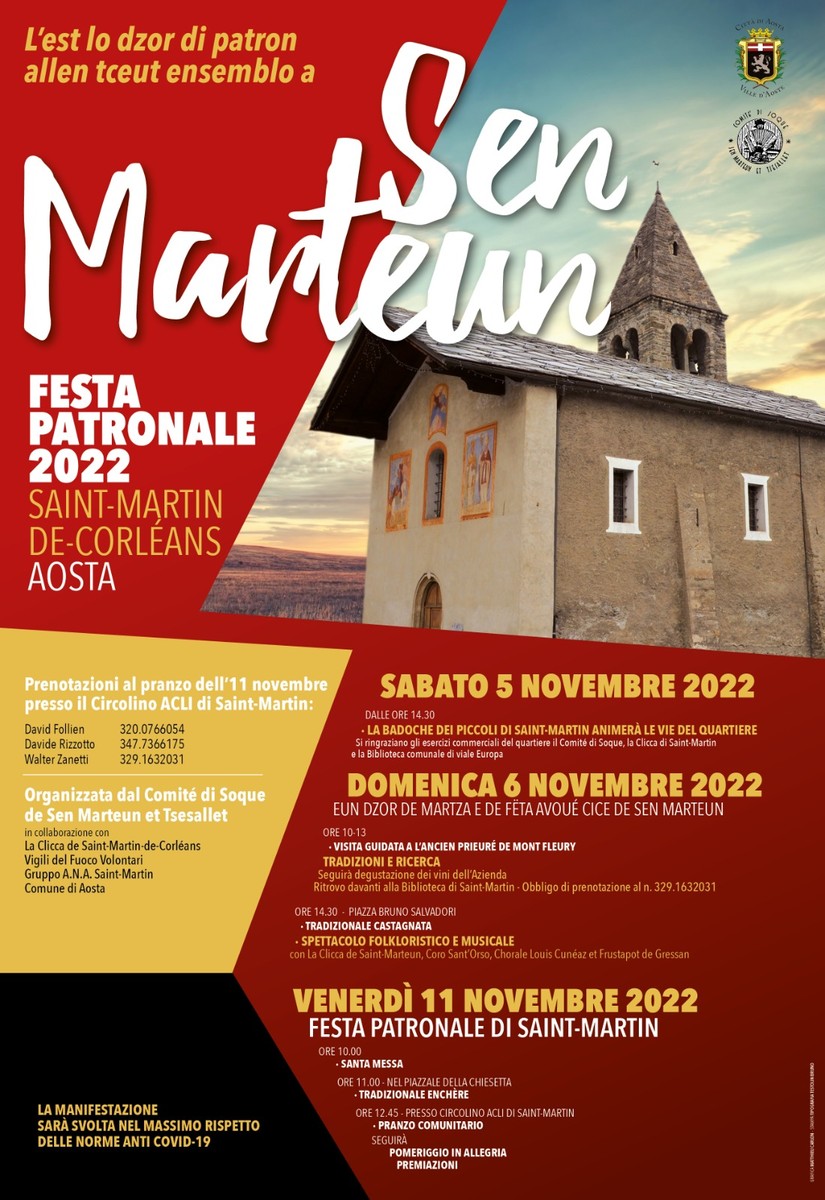 Per tre giorni, nel periodo compreso tra il 5 e l’11 novembre, torna l’appuntamento con la Festa patronale di Saint-Martin-de-Corléans, alla cui realizzazione collabora l’Amministrazione comunale. La manifestazione è organizzata dal “Comité di Soque de Sen Marteun et Tsesallet” nsieme a “La Clicca de Saint-Martin-de-Corléans”, Vigili del Fuoco volontari E Gruppo ANA di Saint-Martin.