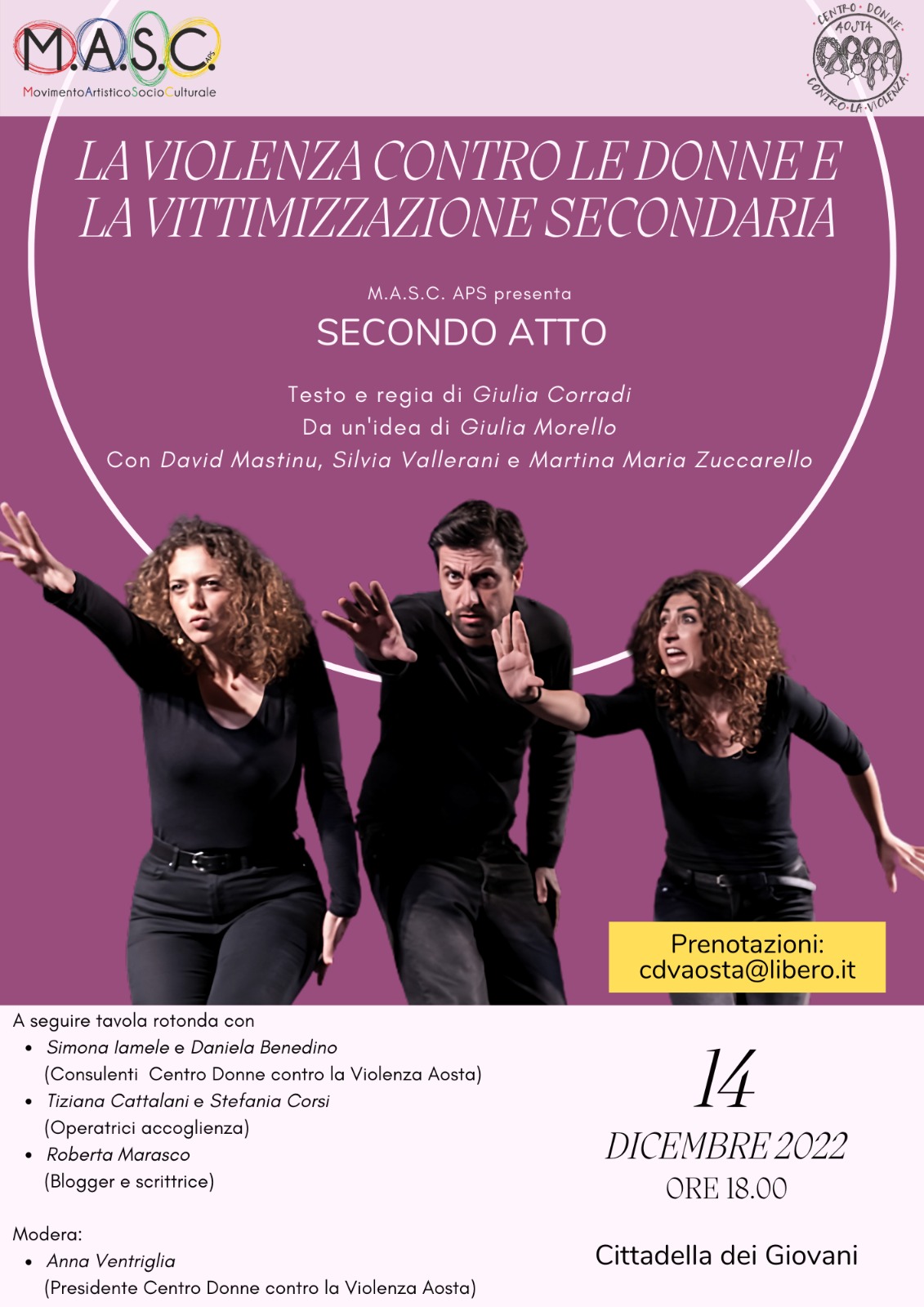 Prima una piece teatrale, replicata già in tutta Italia, dal titolo “ SECONDO ATTO” ideata da Giulia Morello e portata in scena dalla compagnia teatrale M.A.S.C. che racconterà il vissuto di 3 donne: Viola, Patrizia e Samira.