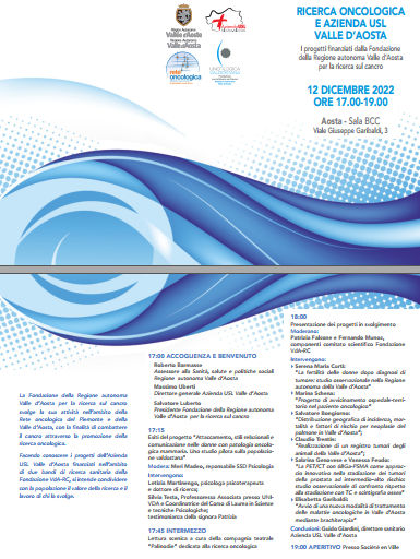 Condividere il valore della ricerca oncologica e il lavoro di chi la svolge, con la presentazione dei progetti finanziati nell’ambito di due bandi di ricerca sanitaria della Fondazione della Regione autonoma Valle d’Aosta per la ricerca sul cancro, è l'obiettivo di una conferenza che si terrà presso la sala delle conferenze della BCC Valdostana di Aosta, in via Giuseppe Garibaldi n. 3, lunedì 12 dicembre dalle ore 17:00 alle 19:00, con ingresso libero.