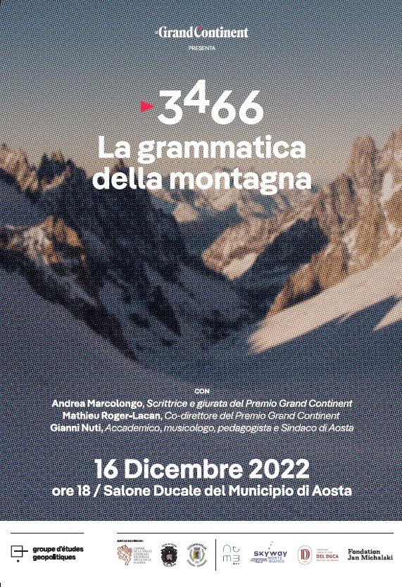 In vista dell’assegnazione del Premio Grand Continent che sostiene la traduzione e la diffusione della letteratura in Europa, venerdì 16 dicembre alle ore 18 il Salone Ducale dell’Hôtel de Ville accoglierà una conferenza-dibattito sul tema “La Grammatica della montagna”.