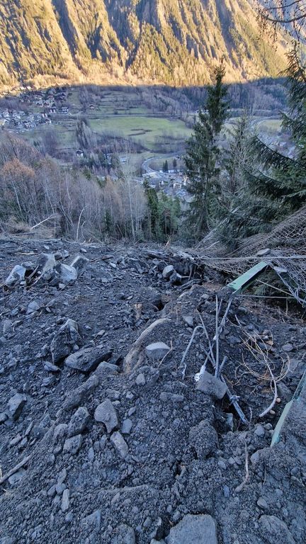 Il distacco stesso, di quasi 2.000 metri cubi, è stato accompagnato da una frana ricca di materiale nevoso, fangoso e detritico che ha favorito una colata su lunga distanza, abbattendo la vegetazione lungo il percorso. Durante la caduta la massa rocciosa si è frantumata in alcuni blocchi di varie dimensioni: alcuni di essi, imponenti, hanno invaso la strada statale, mentre altri si sono arrestati a monte di alcune abitazioni, prontamente evacuate con ordinanza del Sindaco di Pré-Saint-Didier col quale le interlocuzioni sono continuative.
