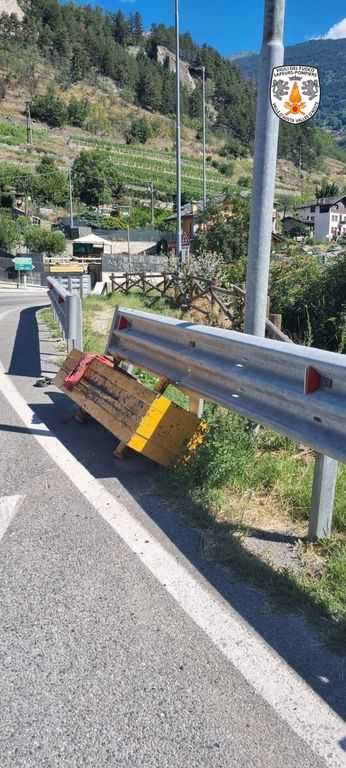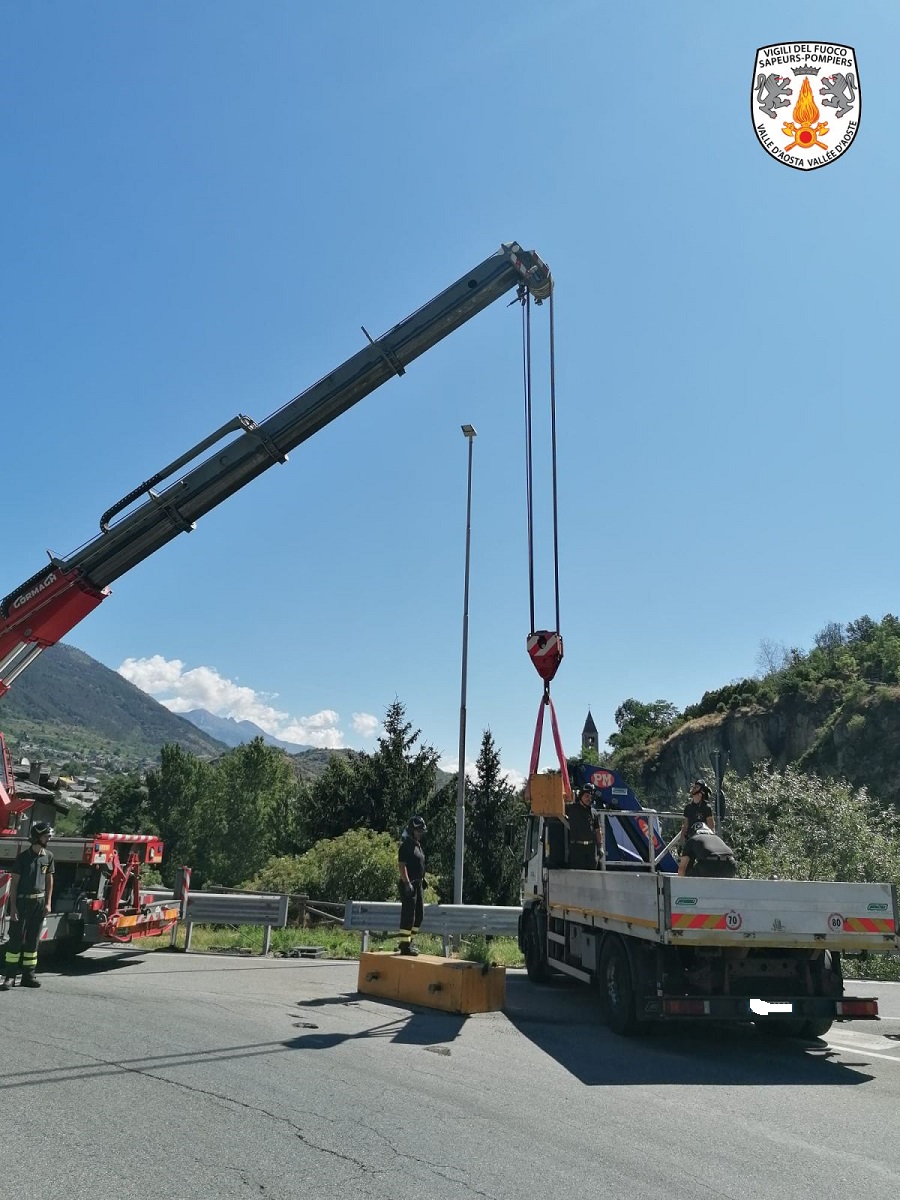 I vigili del fuoro sono intervenuti con 3 mezzi, di cui 1 gru, per il recupero di alcune piastre di ferro dedicate ai collaudi di ponti, cadute da un camion alla rotonda di Villeneuve, sulla ss26.I carichi hanno un peso di 3 e 6 tonnellate.