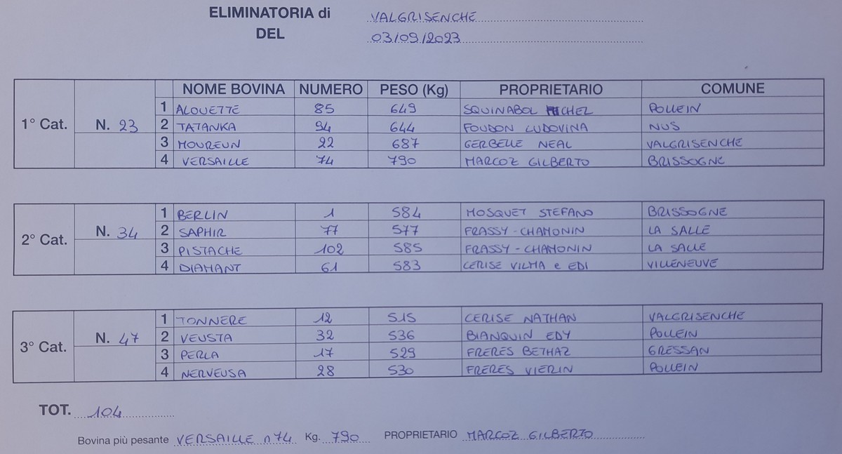 In prima categoria ha vinto "Alouette" (649 chilogrammi) di Michel Squinabol di Pollein, davanti a "Tatanka" (644 chili) di Ludovina Foudon di Nus; terze "Moureun" (687) di Neal Gerbelle di Valgrisenche e "Versaille" (790) di Gilberto Marcoz di Brissogne.