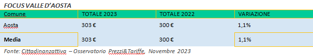 Infatti, è di 303€ la tassa per i rifiuti pagata in media nel 2023 da una famiglia ad Aosta, rispetto ai 320 della media nazionale, con un aumento del 1,1% rispetto al 2022.