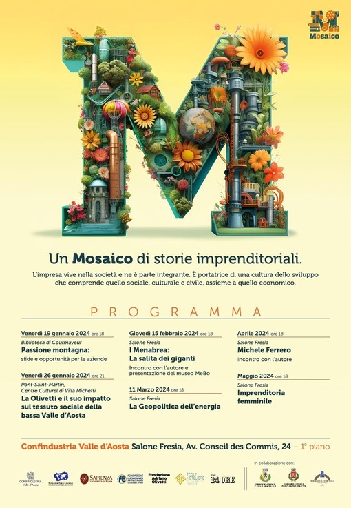 La presentazione della seconda edizione della rassegna Mosaico, promossa dalla Fondation Émile Chanoux e da Confindustria Valle d’Aosta il martedì 9 gennaio, rappresenta un'importante iniziativa che unisce l'ambito culturale e quello imprenditoriale. Questo connubio unico permette di offrire al vasto pubblico un affascinante panorama di storie imprenditoriali, testimoniando la sinergia e l'interconnessione tra cultura, economia e sviluppo sociale.